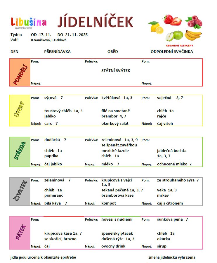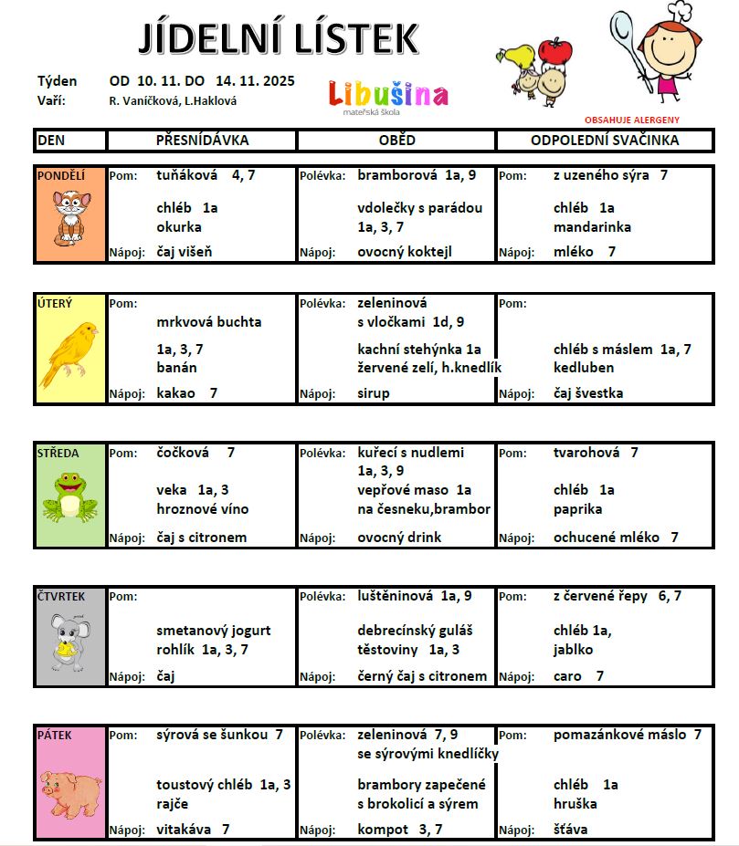 - předem – do sešitu na omlouvání dětí na okénku u školní kuchyně, telefonicky nebo osobně u vedoucí stravování